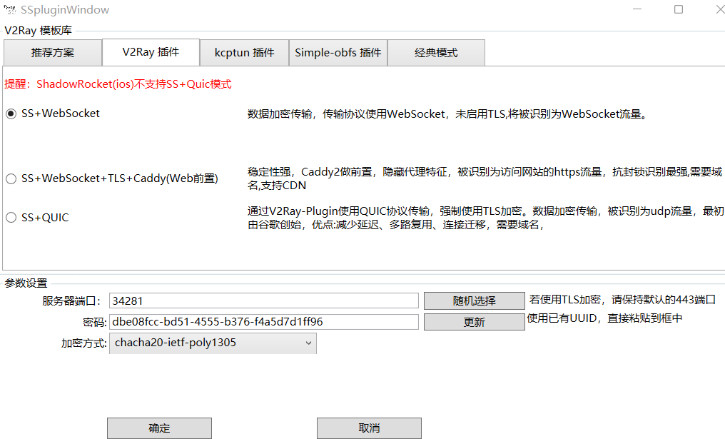 如果你的手机用的是SS客户端,SS客户端没有填协议和混淆的地方,如果你部署的协议和混淆的时候没有选择兼容原版(SS版),因此手机是用不了的。这个时候你把协议弄成兼容原版、混淆也设置成兼容原版即可。或者直接将协议设置成origin且混淆设置成plain。