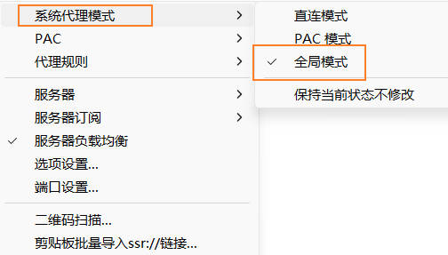 启动SSR客户端后,右键SSR客户端图标,选择第一个“系统代理模式”,里面有3个子选项,选择”全局模式“,之后就可以用浏览器翻墙。