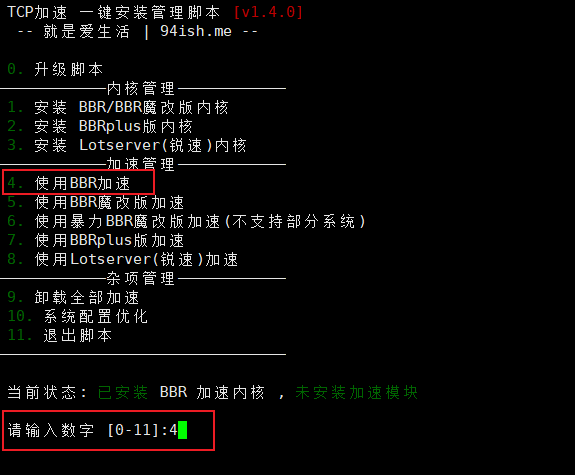 以安装BBR 原版加速为例,输入加速脚本,选择数字4