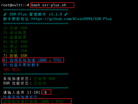 Debian/Ubuntu系统,可以输入数字 8 来启动BBR + TCP Fast Open加速,这样就不用单独部署 BBR 加速脚本。