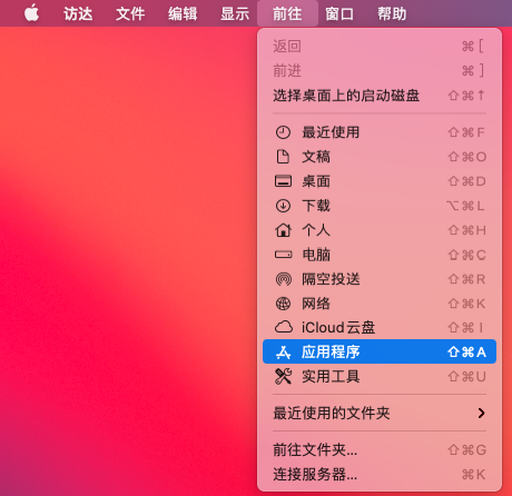 第一步:如图点击“前往”,再点击”应用程序”。