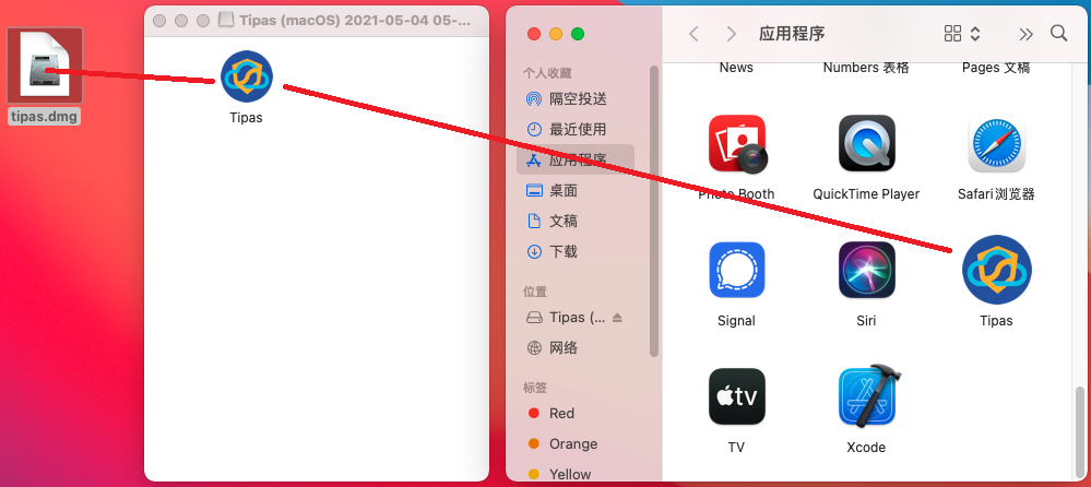 第二步:如图双击dmg文件打开,将Tipas拖拽到“应用程序”窗口里面。