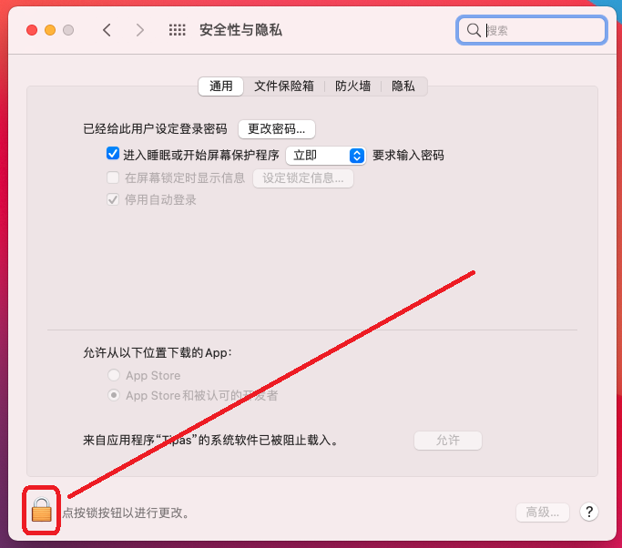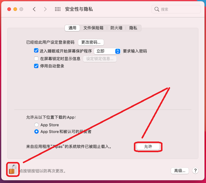 - 回到 系统偏好设置 → 安全性与隐私 → 通用