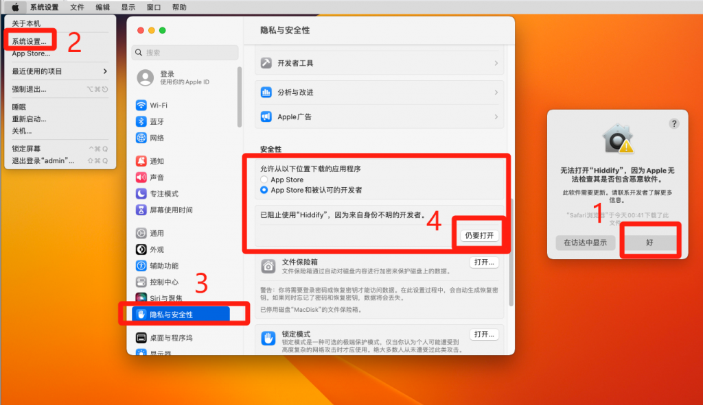 ⚠️【必读】如提示:无法打开“Hiddify”,看下图解决方案【按1、2、3、4 红字顺序操作】。
