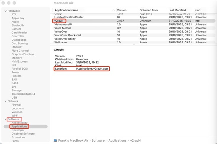在 System Report 的左边找到Software,点开其中 Applications,右边往下滑找到 v2rayN 客户端,点开,复制它的位置 Location: /Applications/v2rayN.app: