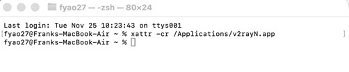 xattr -cr / Applications/v2rayN.app, 回车后输入本电脑密码(输入密码时屏幕不显示任何东西),回车: