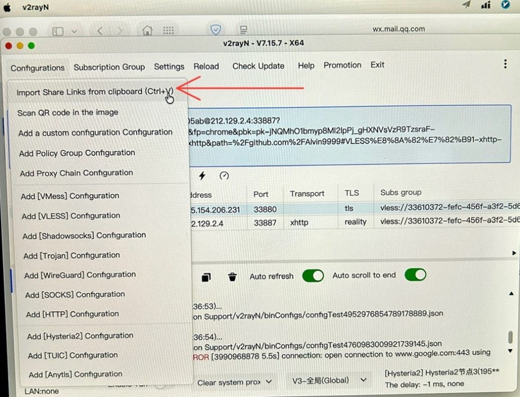 从节点网站一键复制相应节点,黏贴到v2rayN 左上角 “配置” Configurations 中的 Import Share Links from clipboard (Ctrl+V)。可黏贴导入多个节点:
