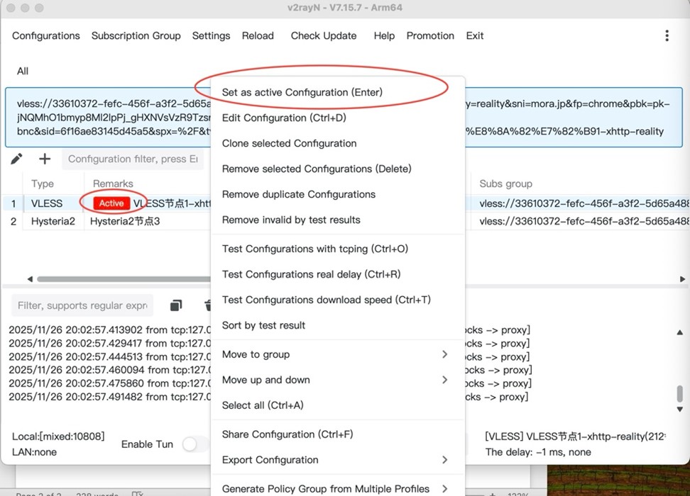 右击已导入节点选择 “Set as active Configuration (Enter)”(或直接回车),选择后被选节点显示红色 “Active”图示,屏幕右上角v2rayN 图标变红色,此时应已连上: